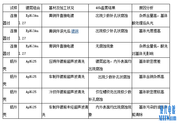 由表可(ke)以(yi)看出,基(ji)體材(cai)料(liao)(liao)、前處理工藝(yi)和電鍍(du)工藝(yi)都對(dui)連接器(qi)的(de)抗蝕性(xing)能(neng)有很大影(ying)響。鋁材(cai)料(liao)(liao)的(de)導電性(xing)和化學(xue)穩定性(xing)雖(sui)然較(jiao)差,但(dan)如果前處理恰當(dang),鍍(du)層組合得好,一樣可(ke)以(yi)達(da)到(dao)較(jiao)高的(de)抗蝕性(xing)能(neng)。因此,現在已經有較(jiao)多(duo)鋁制連接器(qi)產品(pin)問世(shi),以(yi)對(dui)應(ying)銅材(cai)料(liao)(liao)的(de)漲價,同時還可(ke)以(yi)減輕(qing)產品(pin)的(de)重量。