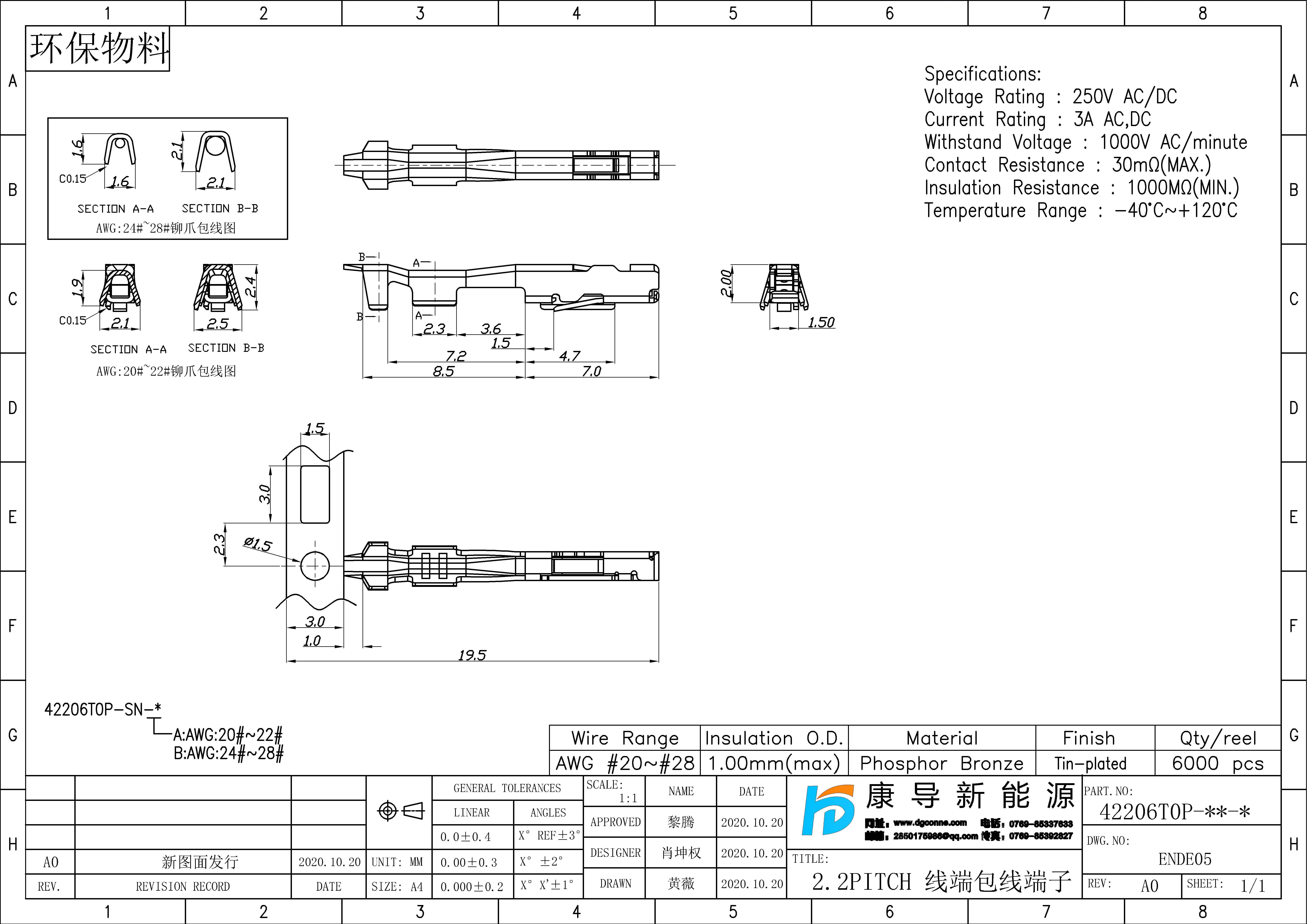 規格型號:PH:2.20MM L:19.50MM AWG22#-AWG28# 線端母端子