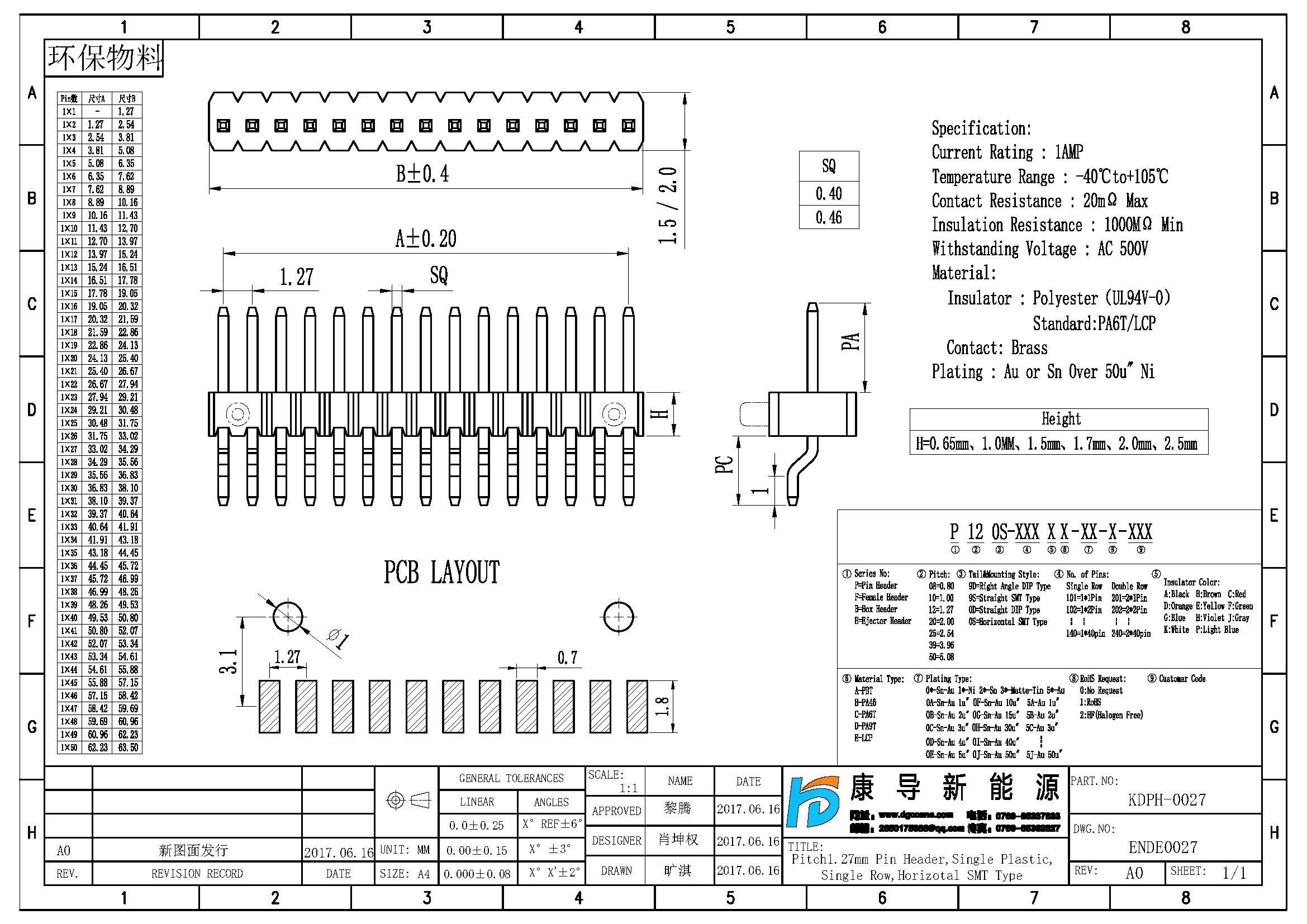規格型號:PH:1.27MM 1*NP 臥貼 單排單塑排針