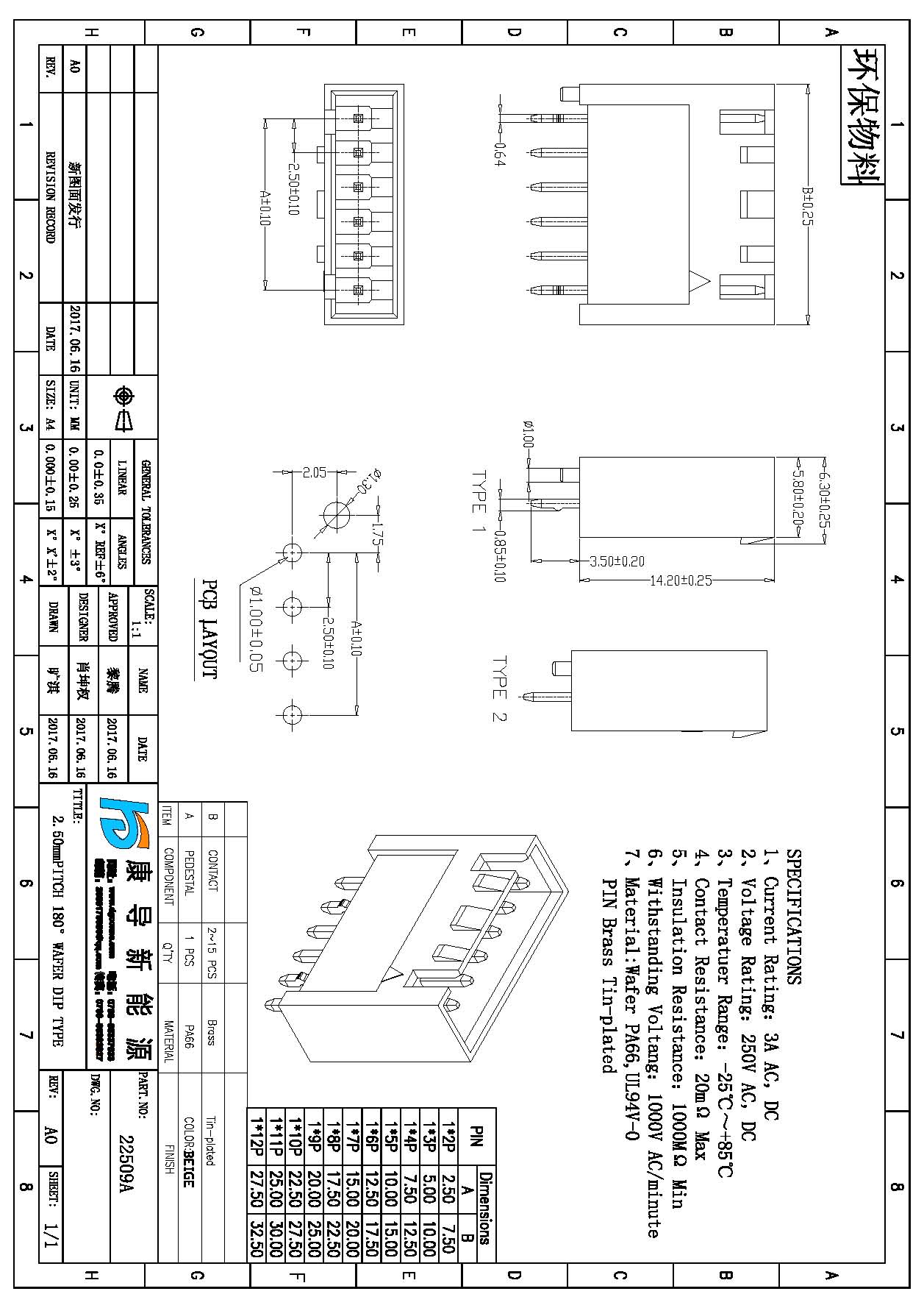 Spec:2.50mm PITCH 180° WAFER DIP TYPE