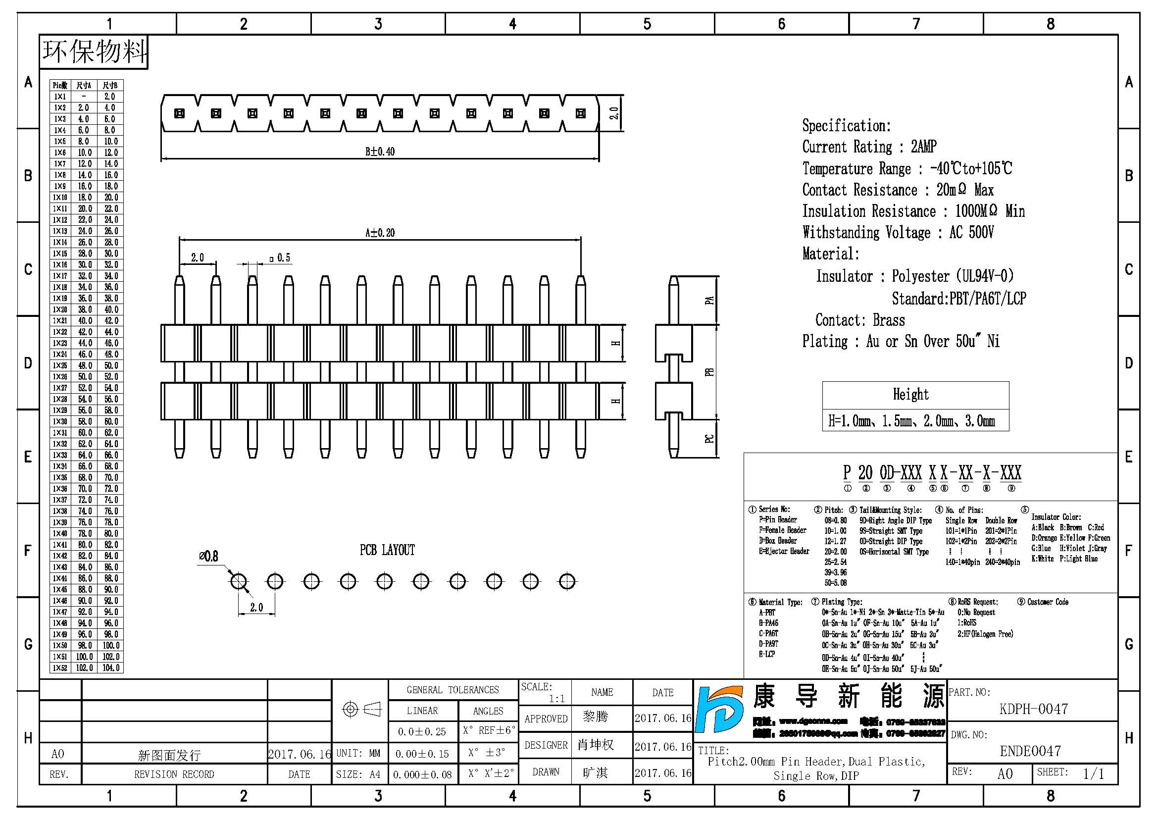 規格型號:PH:2.0MM 1*NP 180度 單排多塑排針